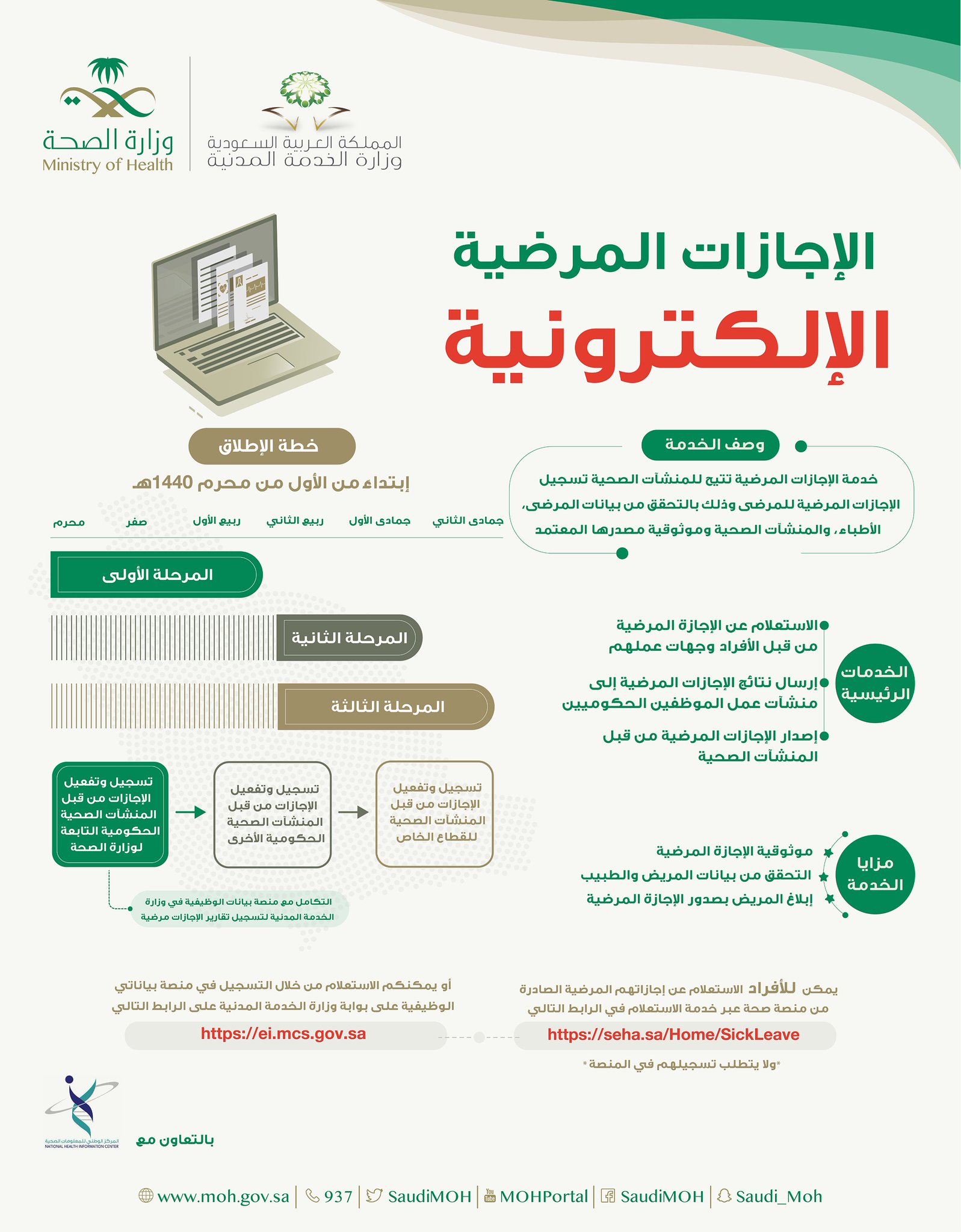 و ز ا ر ة ا لـ صـ حـ ة السعودية Pa Twitter تهدف خدمة الإجازات المرضية الإلكترونية إلى تسهيل إجراءات الحصول على الإجازة المرضية من خلال التحقق من بيانات المرضى وبيانات