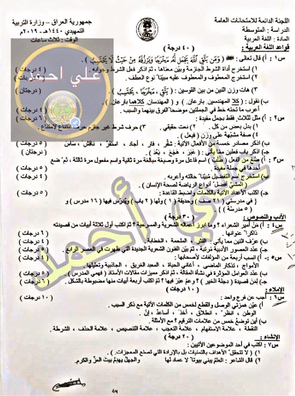 اسئلة مادة اللغة العربية للصف الثالث متوسط مع الأجوبة امتحانات التمهيدي الخارجية 2019